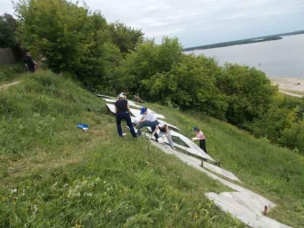 21 и 22 июня городские единороссы провели специальный трудовой десант: конструкция была очищена от травы и затеняющих буквы деревьев, освобождена от слоев старой краски и выкрашена в белый цвет.